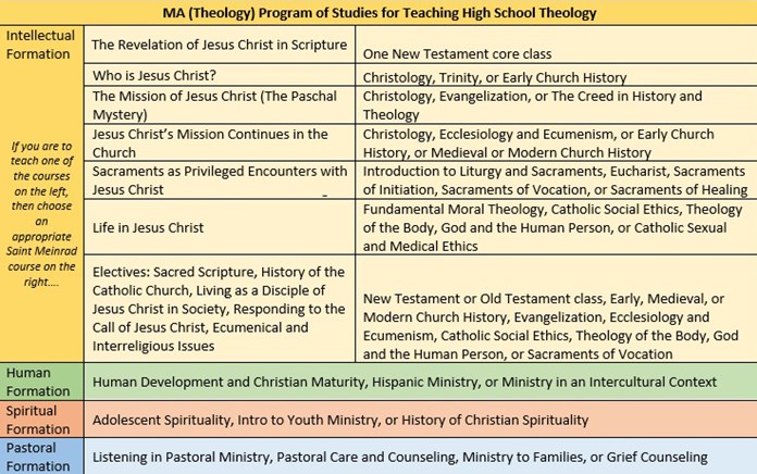 The following chart outlines a program of study aligned with the U.S. Bishops’ national curriculum for high school theology. Those preparing to teach in this curriculum may choose to plan their MA (Theology) core and elective coursework following this guide.